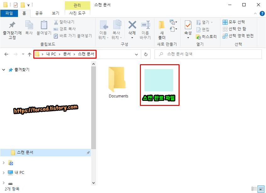 스캔 완료 파일 저장 경로는 내 PC > 문서 > '스캔 문서'입니다. 여기에 스캔 완료된 파일들이 저장됩니다.