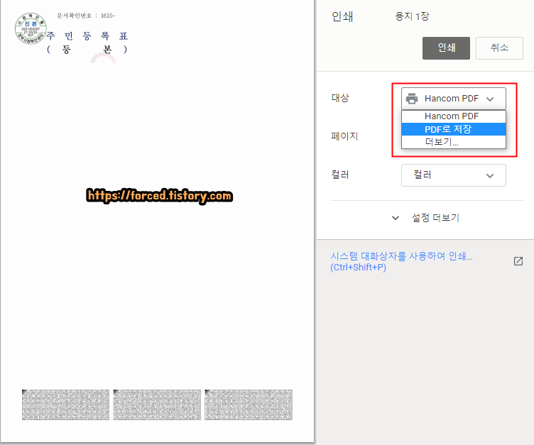 참고로 주민등록등본은 프린터 인쇄뿐만 아니라 PDF 파일 저장도 할 수 있습니다.