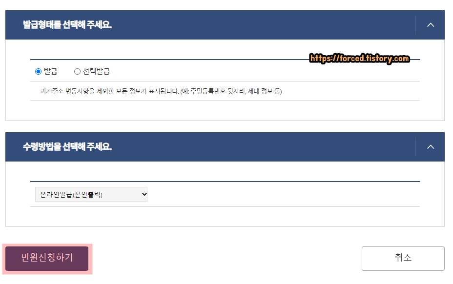 ※ 과거 주소 변동 사항을 제외한 현재 정보만 필요하다면 발급 형태를 '발급'으로 체크해 주세요.