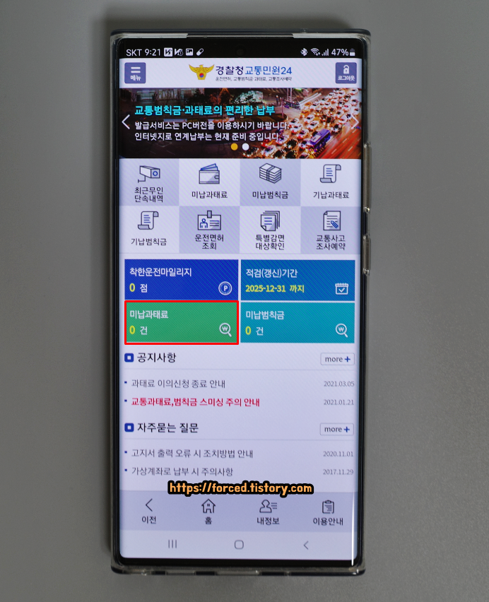 가상 계좌를 통해 청구된 과태료를 바로 납부하니, 미납 과태료가 0건으로 바로 변경되었습니다. 이제부터는 이러한 실수 안 해야죠..