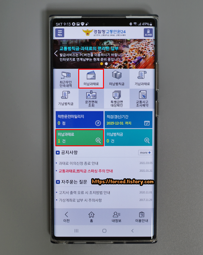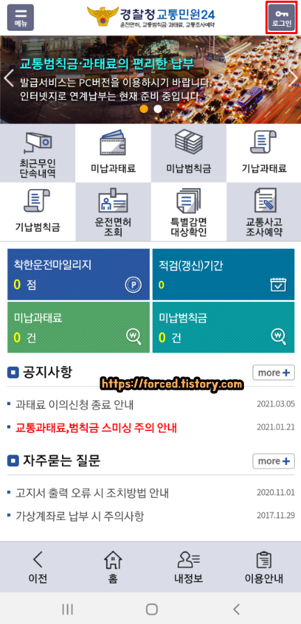 로그인을 완료하면 이렇게 메인 화면으로 이동되는데요. 보니까 저는 미납 과태료가 1건 있다고 나오네요. 과속이든 신호위반이든 무인 단속 카메라에 1번 적발된 적이 있다는 말이겠죠?
