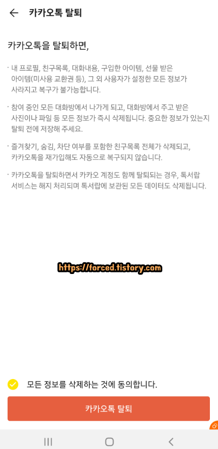 3. 즐겨찾기, 숨김, 차단 여부를 포함한 친구 목록 전차가 삭제되고, 친구 정보는 카카오톡을 재가입해도 복구되지 않음.