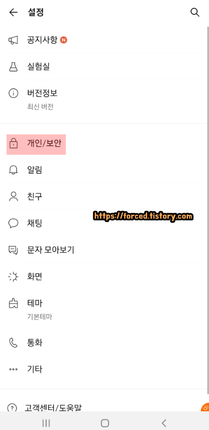 설정 메뉴로 이동한 후, "개인/보안"을 눌러줍니다.