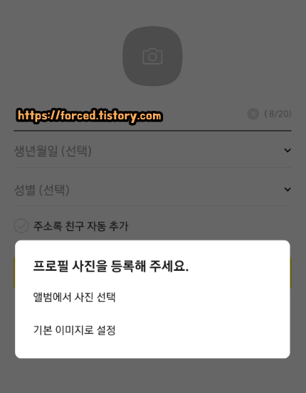 ※ 저처럼 카카오톡 친구 목록을 0명으로 시작하려면, 회원 가입할 때 프로필 설정 단계에서 "주소록 친구 자동 추가"를 체크 해제해 줘야 합니다.