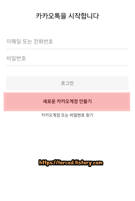 카카오톡 탈퇴가 완료되면, 위와 같이 "카카오톡을 시작합니다."로 이동되는데요. 여기서 재가입을 위해 "새로운 카카오톡 계정 만들기"를 눌러줍니다.