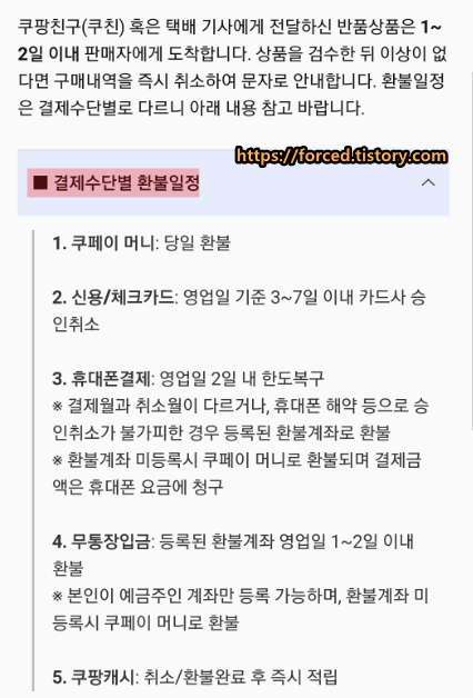 반품의 경우 환불 처리는 상품이 판매자에게 도착한 후, 상품에 이상이 없다면 구매 취소 처리가 완료되며 실질적인 환불은 결제 수단마다 조금씩 다릅니다. 쿠페이 머니(취소 당일 환불), 신용 및 체크카드(영업일 기준 3~7일 이내 카드사 승인 취소), 휴대폰결제(영업일 2일 내 한도 복구), 무통장입금(등록된 환불계좌로 영업일 1~2일 이내 환불), 쿠팡캐시(취소 및 환불 완료 후 즉시 적립)