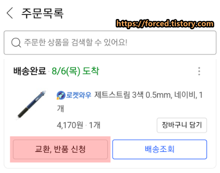 마이페이지의 주문 목록으로 이동한 다음에 교환, 반품 신청 버튼을 눌러줍니다.