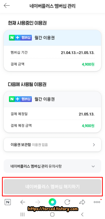 하단에 보이는 '네이버플러스 멤버십 해지하기'를 눌러줍니다.
