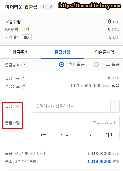 ※ 이더리움은 전송 속도마다 출금 수수료(가스비)가 다릅니다.
