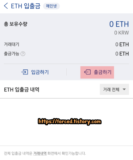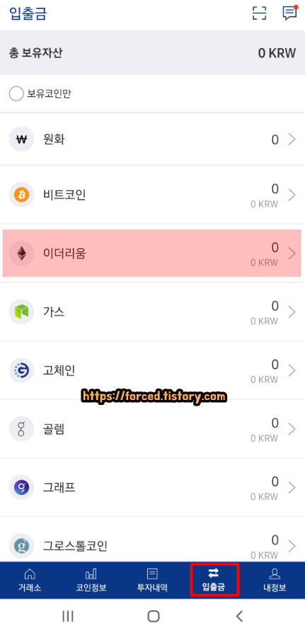 입출금 탭으로 이동한 후, '이더리움'을 터치해줍니다.