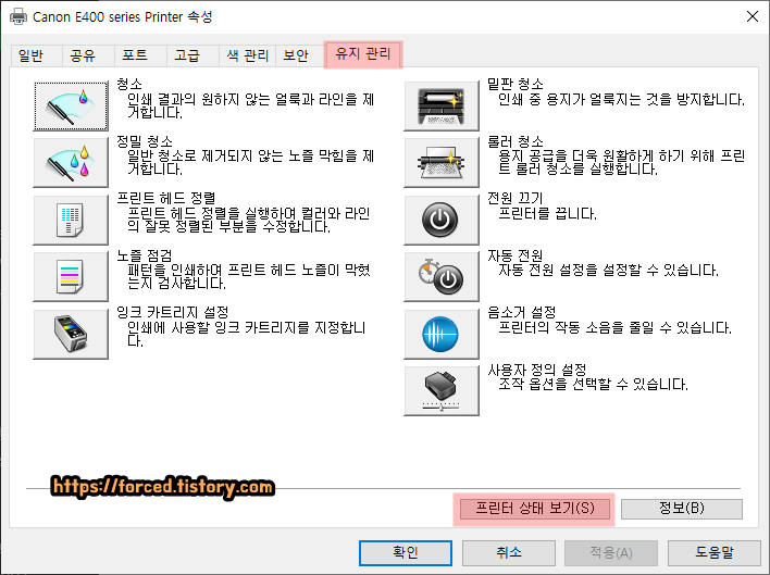 그러면 이렇게 프린터 속성 창이 켜지는데요. 여기서 유지관리 탭으로 이동한 후, 아래에 보이는 '프린터 상태 보기'를 눌러줍니다.