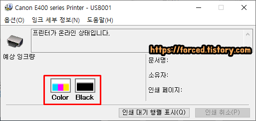 프린터기 잔여 잉크량(컬러, 블랙)은 별도의 프로그램 설치 없이 컴퓨터로 바로 확인할 수 있습니다. 위 사진과 같이 컬러와 블랙 잉크 각각의 잔량을 한눈에 확인할 수 있습니다.