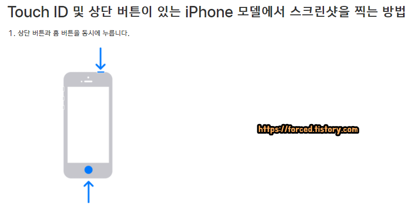 마지막으로 터치 ID 및 상단 버튼이 있는 아이폰 모델이라면, 상단 버튼과 홈 버튼을 동시에 눌렀다 떼주면 됩니다.