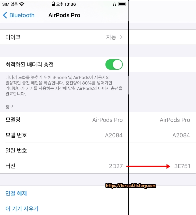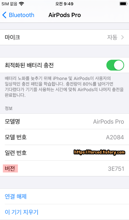 시간이 어느 정도 지난 후, 에어팟 프로와 연결해 펌웨어 버전을 다시 한번 확인해봤습니다. 확인해보니 어느 순간 펌웨어 버전이 '3E751'로 바뀌었더군요. 업데이트 완료 알림 같은 것도 없이 말이죠.