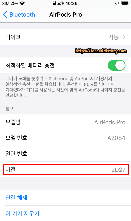 그리고 나의 에어팟 프로 펌웨어 버전을 확인해줍니다. 저는 보니까 제 에어팟 프로 펌웨어 버전이 '2D27'이네요. 21년 06월 기준으로 최신 버전이 '3E751'인데. 저는 한참 낮은 버전을 사용하고 있네요. 지금 당장 업데이트해줘야겠어요.!!