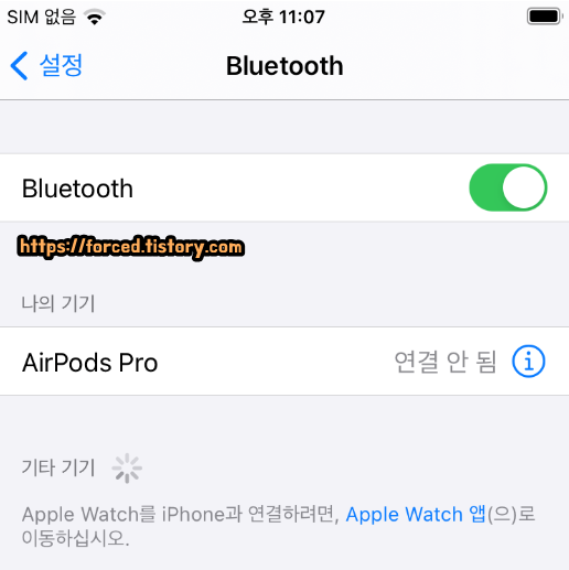 당연스럽게도 에어팟 프로를 충전 케이스를 넣고 닫으면 블루투스 연결은 이렇게 해제가 됩니다. 이 상태에서 업데이트가 될 때까지 기다려주면 됩니다. 참고로 저는 에어팟 프로 충전 케이스를 충전기에 꽂지 않은 상태로 두고 기다렸는데요. 업데이트 완료까지 생각보다 많은 시간(30분 이상)이 필요했습니다. 개인적으로 에어팟 프로 업데이트에 대해 여러 정보들을 취합해본 결과 에어팟 프로를 충전 상태로 두면 업데이트 진행이 더욱 빠르다는 결론이 나왔습니다.