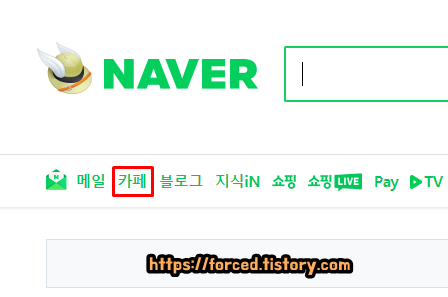 네이버 홈페이지 접속 후, 로그인을 해줍니다. 그리고 메인 화면 상단에 보이는 '카페'를 눌러줍니다.