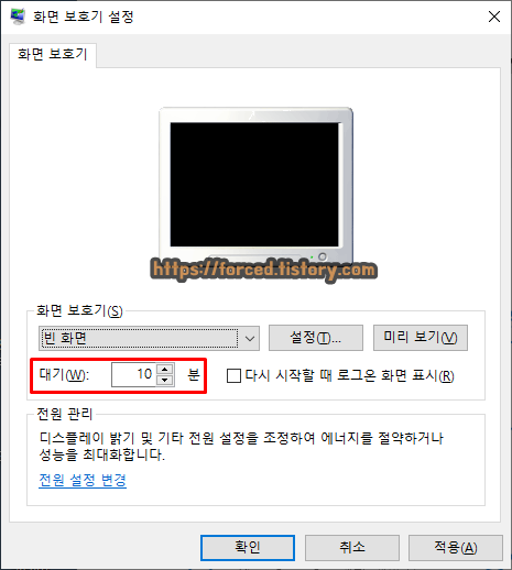 그리고 대기 시간을 설정해줍니다. 예를 들어 위와 같이 화면 보호기 대기 시간을 10분으로 설정했다면, 아무 동작이 없는 상태에서 10분이 지나면 내가 설정한 화면 보호기가 켜지게 됩니다.