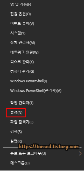 화면 보호기 설정 방법은 매우 간단합니다. 먼저 시작 메뉴에 마우스 커서를 대고 우클릭을 해줍니다. 그리고 이어서 '설정(N)'을 눌러줍니다.