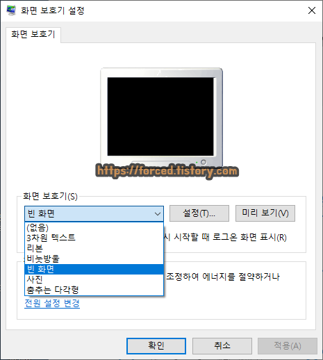 위와 같이 화면 보호기 설정 창이 켜지면, 일단 화면 보호기 그림을 '빈 화면(그냥 검은 화면)'으로 설정해줍니다.