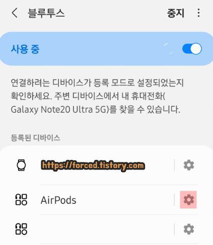 먼저 블루투스 메뉴로 이동한 후, 에어팟(AirPods) 우측에 보이는 '설정(톱니바퀴 모양)'을 눌러줍니다.