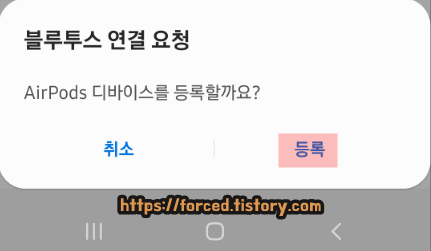 위와 같이 블루투스 연결 요청 창이 뜨면 '등록'을 눌러줍니다.