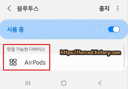 에어팟 페어링 초기화 이후, 블루투스 메뉴로 들어가면 하단에 '연결 가능한 디바이스'에 AirPods(에어팟)이 보일 것입니다. 블루투스 기기 등록 및 연결을 위해 'AirPods'을 눌러주세요.