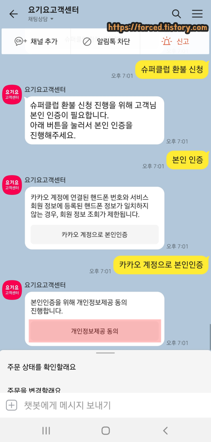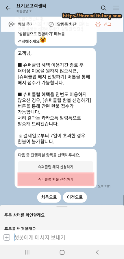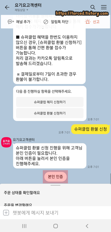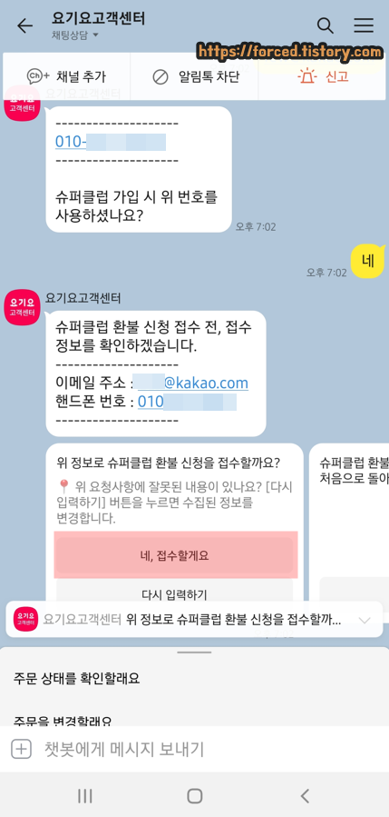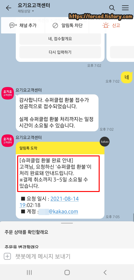 슈퍼클럽 환불 처리가 완료되면, 요기요에서 환불이 완료되었다고 알림톡도 보내줍니다. 요기요 슈퍼클럽 이용료 환불받기 어렵지 않죠?