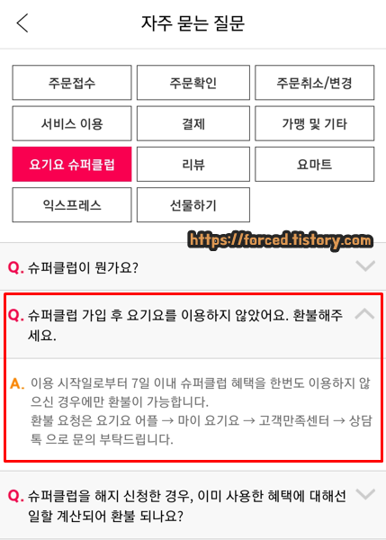 요기요 슈퍼클럽 이용료 환불 신청은 요기요 상담톡(모바일)을 통해 가능합니다.