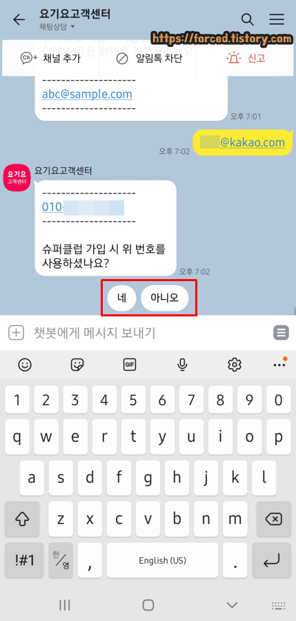 환불받을 계정 이메일 주소를 입력하면 해당 계정에서 사용한 휴대폰 번호 정보가 자동으로 조회되어 나오는데요. 정보에 이상이 없다면, '네'를 눌러줍니다.