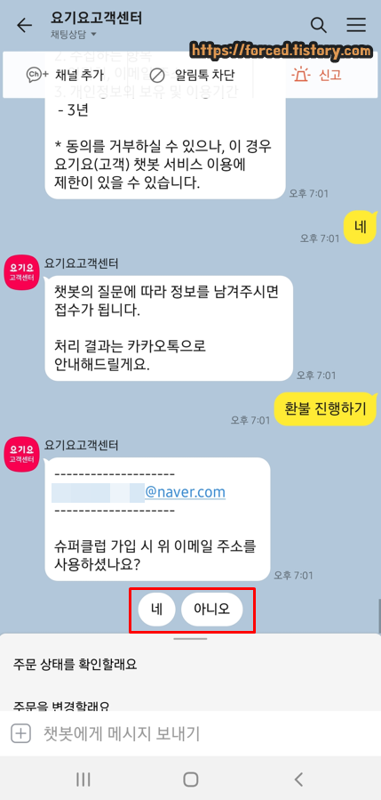 환불 접수 정보(이메일 주소, 핸드폰 번호)를 확인한 후, 이상이 없다면 아래에 보이는 "네, 접수할게요"를 눌러 환불 신청 접수해줍니다.