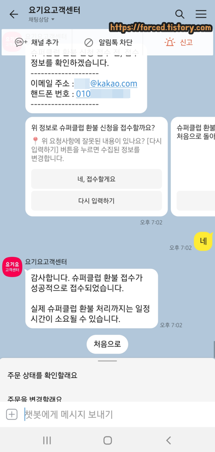 요기요 슈퍼클럽 환불 접수 후, 3분 정도 지나니 환불 처리가 완료되었습니다. 생각보다 일이 금방 처리돼서 깜짝 놀랐네요.