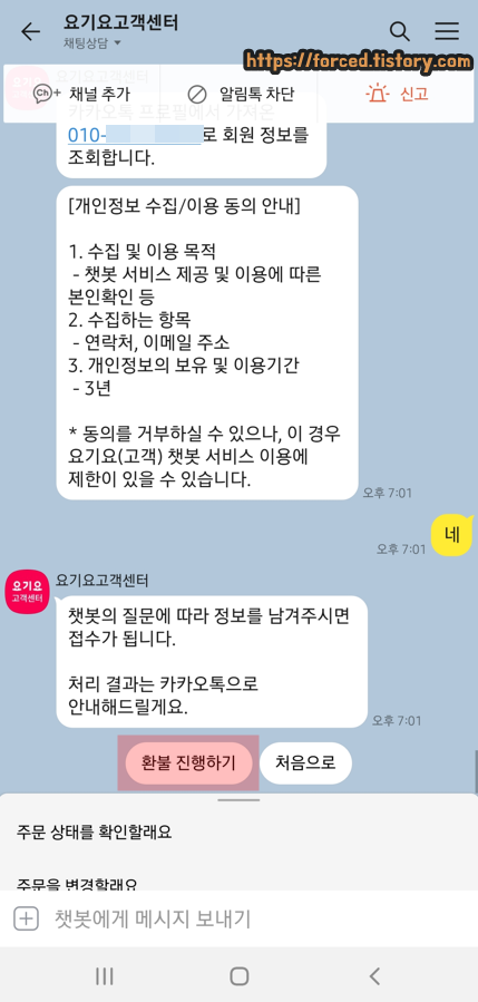 "네, 접수할게요" 버튼을 누르면, 환불 신청 접수가 완료됩니다. 이제 환불이 처리될 때까지 기다리는 일만 남았네요.