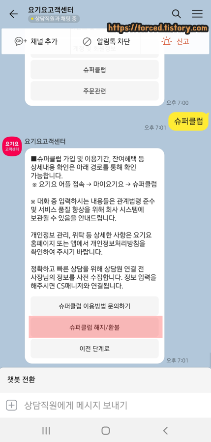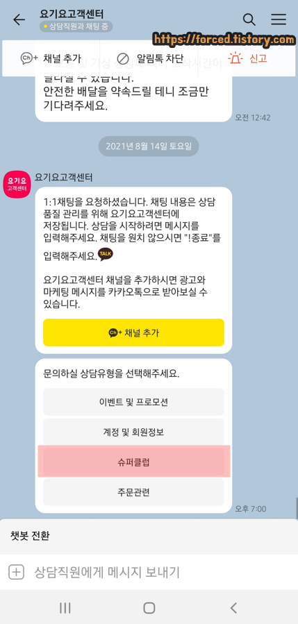 그럼 이렇게 요기요 상담톡으로 이동되는데요. 여기서 상담유형에 보이는 '슈퍼클럽'을 눌러줍니다.