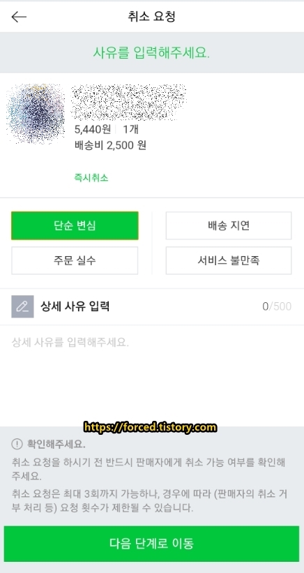 주문 최소 사유(단순 변심, 배송 지연, 주문 실수, 서비스 불만족)를 선택하고, 아래에 다음 단계로 이동 버튼을 눌러줍니다.