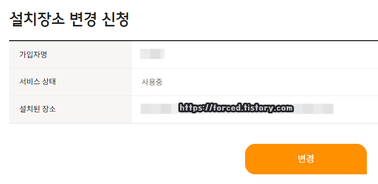 로그인 후, 마이페이지 > 가입상품정보관리 > '설치장소 조회/변경'을 눌러줍니다.