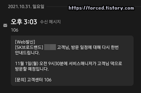 인터넷에서 이전 설치 신청을 한 후, 2일 정도 경과됐을 때쯤 SK브로드밴드 고객센터 106에서 전화가 왔습니다. 상담원이 유선상으로 이전 설치 정보(주소 등)를 확인한 후, 해당 주소지에 SK 인터넷 설치가 가능한지 확인합니다.