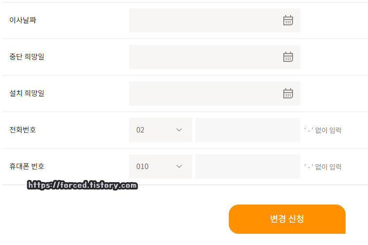 이어서 이사날짜, 중단 희망일, 설치 희망일, 휴대폰 번호를 입력해줍니다. 입력을 완료했다면, 아래에 보이는 '변경 신청 버튼'을 눌러줍니다.
