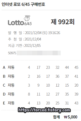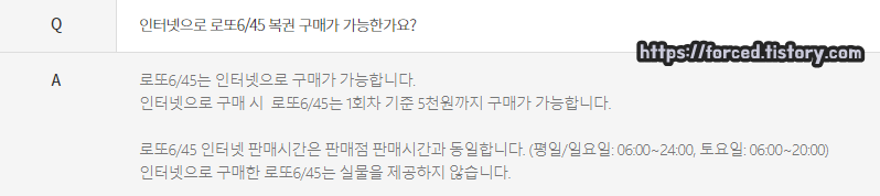 로또6/45는 인터넷으로도 구매가 가능하며, 인터넷으로 구매 시 회차당 5천 원까지만 구매가 가능합니다. (오프라인은 최대 10만 원까지 구매 가능)