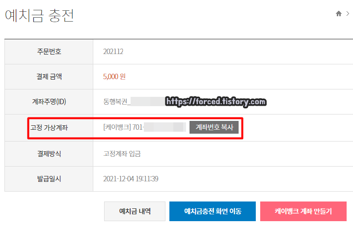 충전 신청을 완료하면 '고정 가상계좌'라는 것을 확인할 수 있는데요. 해당 계좌번호로 내가 선택한 금액만큼 입금해주면 됩니다. 저는 5천원을 충전해보도록 하겠습니다.