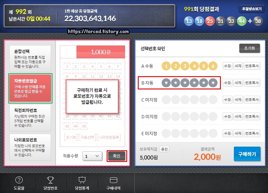 다음으로 '자동번호발급'입니다. 자동번호발급을 선택한 후, 아래에 보이는 확인 버튼을 누르면 번호 6개가 랜덤으로 선택되며 랜덤으로 선택된 번호는 로또 구매 완료 후에 정확히 확인할 수 있습니다.