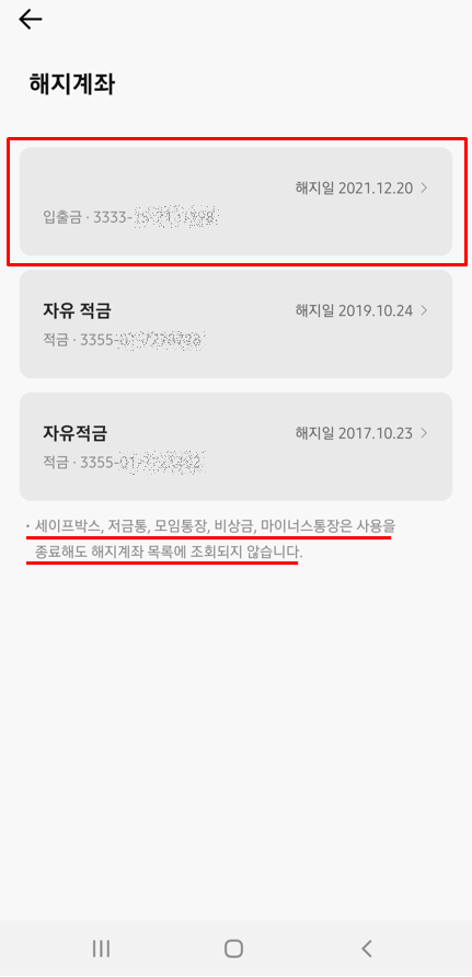 ※ 카카오뱅크 세이프박스, 저금통, 모임 통장, 비상금, 마이너스통장은 사용을 종료해도 해지 계좌 목록에 조회되지 않습니다.