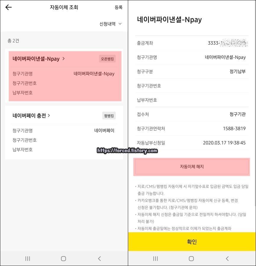 보니까 해당 계좌는 자동 이체가 2개나 연결되어있는 상태였네요. 여기서 자동이체 정보를 터치한 후, 자동이체 해지 버튼을 눌러줍니다.