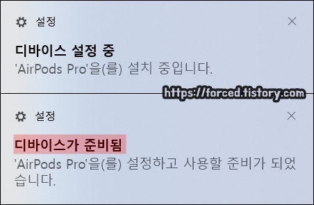 이어서 '디바이스 설정'을 진행하는데요. 우측 하단 알림에 이렇게 '디바이스가 준비됨'이라고 뜬다면 에어팟 프로 연결은 완료된 것입니다.