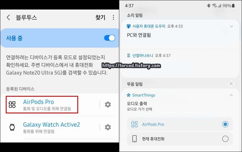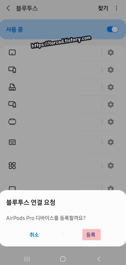 그러면 이렇게 에어팟 프로가 '등록된 디바이스'로 들어가게 되며, 앞으로 블루투스 등록 해제 또는 페어링 초기화를 하지 않는 한 자동으로 연결되고 해제됩니다