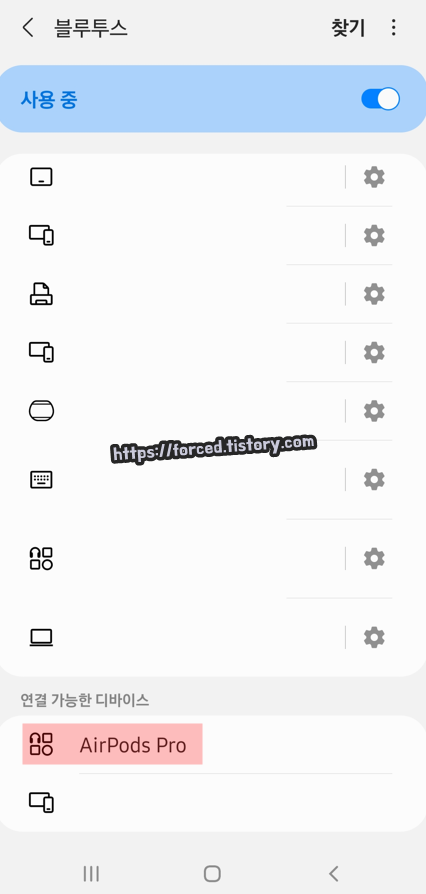 페어링 초기화를 완료했으니 이제 에어팟과 다시 연결을 해봅시다. 블루투스 연결 가능한 디바이스 목록에 보이는 'AirPods Pro'를 눌러줍니다.