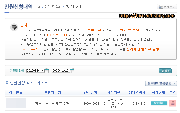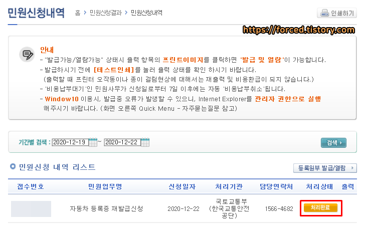 자동차 등록증 인쇄가 시작되면 처리 상태가 이렇게 '처리완료'로 바뀝니다. 이 상태가 되면 등록증 재출력은 물론 발급 수수료 환불 신청도 불가능하니 참고하세요.