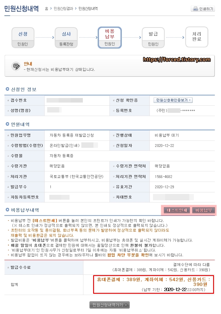 이제 우리는 테스트 인쇄와 비용 납부를 해줘야 합니다. 비용 납부 전에 일단 테스트 인쇄라는 것을 먼저 해주세요. 프린터 오작동 및 종이 걸림 등의 문제로 등록증이 제대로 출력되지 않더라도 재출력이나 발급 수수료 환불이 불가능하기 때문입니다.