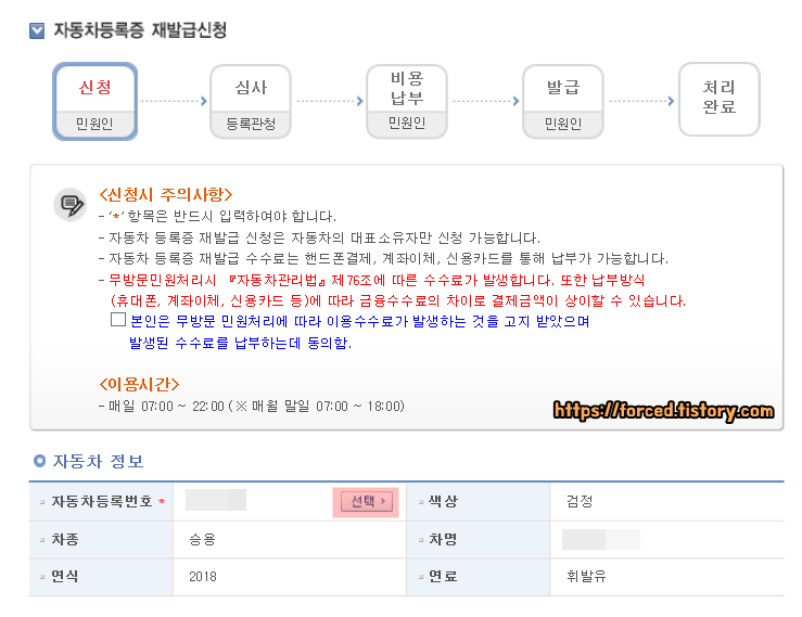 자동차 등록증 재발급은 인터넷 또는 자동차 등록 사업소를 통해 쉽게 처리할 수 있는데요. 인터넷에서는 매일 07시부터 22시까지 자유롭게 발급 신청이 가능하지만 차량 등록 사업소 같은 경우에는 공무원 분들이 근무하는 평일 오전 9시부터 오후 6시까지만 발급이 가능하다는 차이가 있습니다. 그리고 발급 수수료는 1천원 이하입니다.